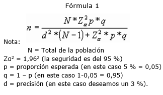 El muestreo utilizado fue no probabilístico intencionado aplicando la siguiente fórmula para determinar el tamaño de la misma (Fórmula 1).