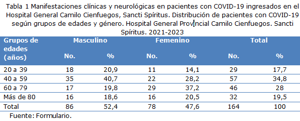 Methods: A prospective, observational study was carried out at the institution. The population under study consisted of 480 patients and the intentional non-probabilistic sample was made up of 164 patients with COVID-19 who had neurological manifestations during the study period and met the inclusion and exclusion criteria. The variables used were: age, sex, occupation, associated comorbidities, clinical form of the disease, immunization, symptoms and signs of the disease, complications and status at discharge.
