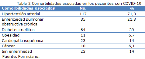 La distribución de las enfermedades asociadas en estos pacientes, mostró que el 71,3 % (117) eran hipertensos y el 39 % (64) padecían de diabetes mellitus; algunos de estos pacientes presentaron más de una enfermedad asociada (Tabla 2).