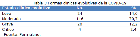 Según la evolución clínica de la COVID-19 aportó que el 70,7 % (116) presentaron un estado clínico de gravedad moderado, seguido de los pacientes con formas leves con el 14,6 % (24) (Tabla 3).