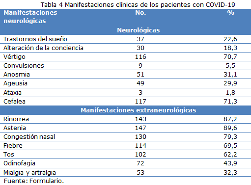 La mayoría de los pacientes sintomáticos refirieron haber tenido más de dos o tres síntomas o signos de la enfermedad destacándose la cefalea con 117 para un (71,3 %) y los vértigos un 70,3 % (116) como síntomas neurológicos más frecuentes (Tabla 4).