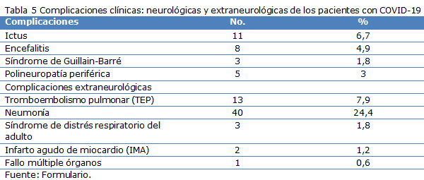 En cuanto al comportamiento de las complicaciones presentadas por los pacientes predominó el ictus con un 6,7 % (11), seguido de la encefalitis con 4,9 % (8). Dentro de las complicaciones no neurológicas la neumonía fue la más frecuente con el 24,4 % (40) (Tabla 5).