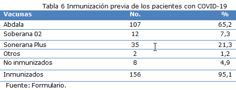 La distribución de la inmunización de los pacientes ingresados, determinó que el 95,1 % fue inmunizado (156) y de ellos el 65,2 % (107) con la vacuna Abdala (Tabla 6).