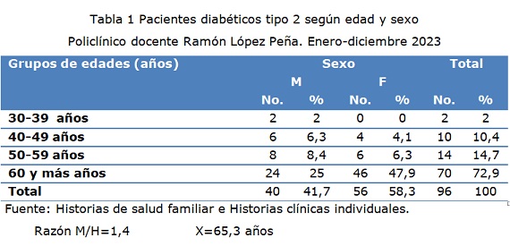 Method: A descriptive and cross-sectional study was carried out in 96 patients classified as type 2 diabetics, belonging of the Ramón López Peña Teaching Polyclinic in the municipality of Santiago de Cuba from January to December 2023, variables such as age, sex, risk factors, comorbidities and presence of complications were determined. Descriptive statistical techniques such as absolute frequency and percentage were used.