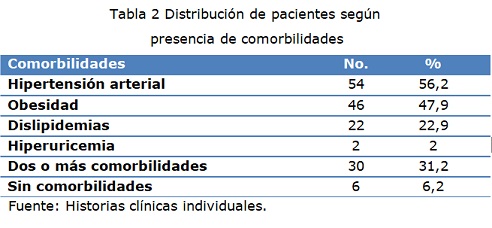 La hipertensión arterial fue la comorbilidad más frecuente con 54 pacientes (56,2 %), seguido por la obesidad con 46 casos (37,5 %). Resultó interesante destacar que el (31,2 %) de los pacientes presentaron dos o más comorbilidades asociadas (Tabla 2).