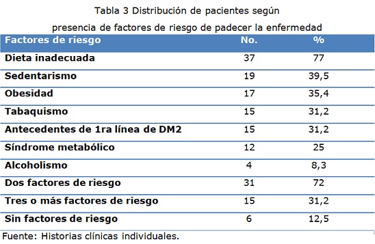 La dieta inadecuada con 37 pacientes (77 %), fue el factor de riesgo más representativo, seguido por el sedentarismo con 19 casos (39,5 %). Resultó interesante destacar que el (72 %) de los pacientes presentaron dos o más factores de riesgo asociados, de ellos, en el (25 %) coexistían tres o más (Tabla 3).
