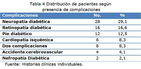 La neuropatía diabética fue la complicación más frecuente con 28 pacientes (29,1 %); seguido de la retinopatía diabética con 16 casos (16,6 %). Ocho pacientes para (8,3 %), presentaron más de una complicación (Tabla 4).