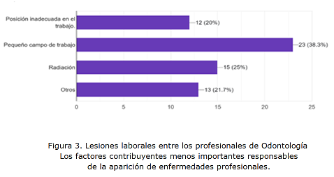 Entre las causas de las enfermedades y lesiones laborales, que fueron identificadas por los encuestados como los factores de riesgo más importantes en el estudio, se destacó el ruido (40 %) y las infecciones (31,7 %); mientras que las menos importantes tenemos el pequeño campo de trabajo (38,3 %) y la radiación (25 %). Es así, que Boszczowski et al.,(24) coinciden con Santiago y Rosado,(25) al decir que el dolor en la región cervical es un problema de salud pública que no solo afecta en la edad adulta, si no también a edades tempranas, si no es tratado a tiempo, puede ser considerado una lesión laboral.