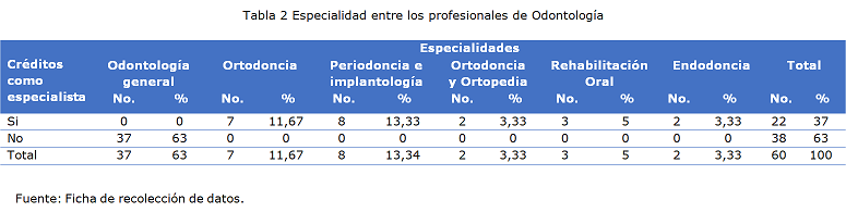 La distribución de los encuestados, un 35 % contaba con una especialidad, en su mayoría eran odontólogos generales con un 63 % y un 37 % contaba con una especialidad; sin embargo, todas las ramas especializadas estaban cubiertas por las respuestas (Tabla 2).