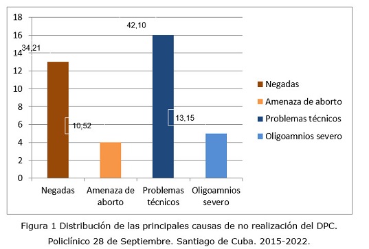 Durante el período analizado para esta investigación, el diagnóstico prenatal citogenético en líquido amniótico fue realizado en 218 grávidas de las 258 evaluadas en la consulta de asesoramiento genético con criterio para DPC lo que representó el 85,15 % del universo; exponiéndose en la figura 1 las principales causas de no realización (Figura 1).