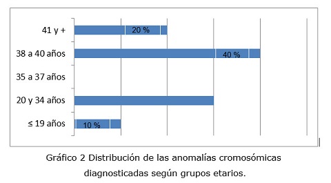 Al analizar los resultados positivos obtenidos, según grupos de etarios, se pudo observar que en el grupo entre 35 a 37 años no hubo diagnósticos positivos de aneuploidías y como preponderaron en el grupo etario entre 38 a 40 años (Gráfico 2).