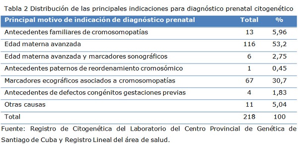 Results: Of the total number of pregnant women to be studied, only 218 (85,15%) underwent prenatal cytogenetic study for chromosomopathies. Conclusive results for diagnosis were obtained in 166 cases (76, 14 %) of which 156 (93,97%) were negative and 10 were positive (6,03%). Numerical chromosomopathies were the most diagnosed and within this y trisomy 21. The main cause of indication, for this type of study, was advanced maternal age in more than half of the cases fallow to the cases with abnormalities diagnosed by ultrasound marks. All couples with positive results for aneuploidies in the fetus opted for voluntary termination of pregnancy.
