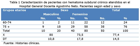 Conclusiones: Se puede concluir que en la investigación existió una tendencia a que el hematoma subdural crónico predominara en pacientes de género femenino, fundamentalmente con una causa traumática y con una evolución que podía extenderse hasta los tres meses en ocasiones.