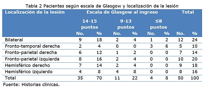 Métodos: Se realizó un estudio descriptivo, transversal, de un universo de 145 pacientes, se tomó una muestra aleatoria simple de 50 enfermos. Las variables fueron: Edad, género, localización, escala de Glasgow al ingreso, complicaciones, sintomatología, tiempo transcurrido desde el evento traumático al inicio de los síntomas, técnica quirúrgica, método anestésico, tiempo quirúrgico y resultados neuroquirúrgicos.