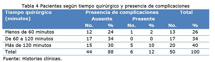 El método anestésico utilizado con mayor frecuencia fue la local y sedación, que representó un 80 % (40/50), seguido de la anestesia general orotraqueal que se utilizó en un 20 % (10/50) de los enfermos. El 40 % (20/50) de los pacientes presentó un tiempo quirúrgico de más de 120 minutos, no hubo complicaciones en la mayoría de los pacientes estudiados, (44/50) lo que representó un 88 % del total. (Tabla 4).