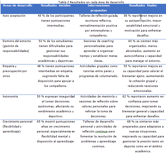 Results: To further stimulate this growth, by suggesting activities that encourage problem-solving and continuous learning. Interventions in this area consisted of personal development workshops and continuous reflection activities. The results indicated that 68 % of students who participated in these programs felt more prepared to adapt to new situations and adjust their behaviors based on previous experiences, which improved their ability to manage pressure both in sports and academics.