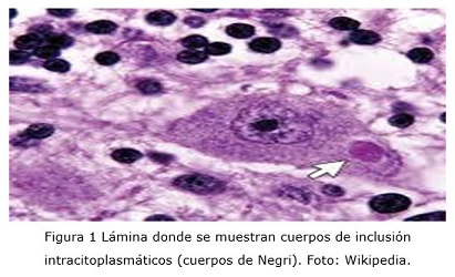 El siguiente descubrimiento se debió a Adelchi Negri en 1903, quien halló cuerpos de inclusión intracitoplasmáticos, en células nerviosas de animales y humanos, que se consideraron patognómicos de la enfermedad (Figura 1).(6)