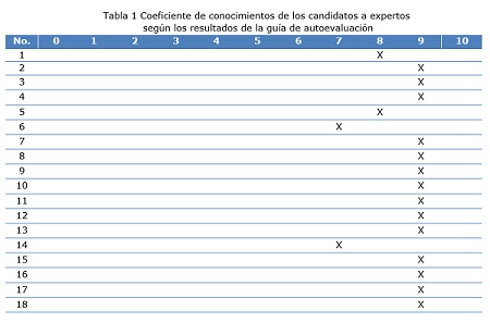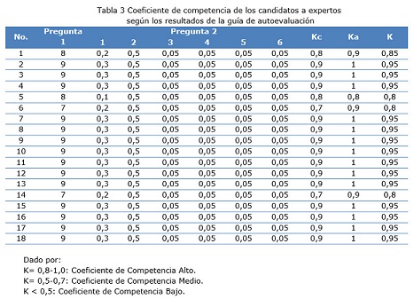 A partir de los resultados estadísticos obtenidos fueron seleccionados como expertos, 18 profesionales especialistas con Alta competencia (Tabla 3).