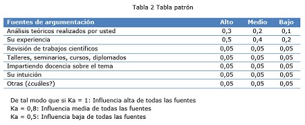 Ka fue obtenido a partir de la suma de los puntos a las respuestas relacionadas con el grado de influencia de las fuentes de argumentación luego de haber marcado con una cruz (X) en la casilla seleccionada. Fue calculado a través de la fórmula Ka = (n1+ n2 + n3+ n4 + n5 + n6), donde ni es el valor correspondiente a la fuente de argumentación i (1 hasta 6) y los resultados contrastados con los valores de una tabla patrón (Tabla 2).