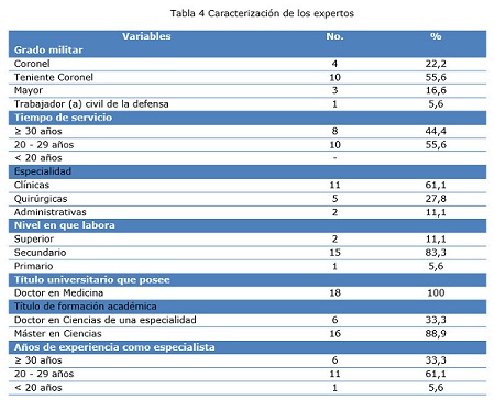En la caracterización de los expertos se pudo observar que el total de ellos fueron doctores en medicina y más de la mitad primeros oficiales con tiempo de servicio entre 20 y 29 años. Un número considerable de los mismos hicieron especialidades clínicas, son especialistas de segundo grado, han ejercido en la especialidad por más de 20 años y prestan asistencia médica en el nivel secundario. Casi la totalidad de los expertos tiene la categoría de máster en ciencias y un tercio del total son doctores en ciencias de una especialidad (Tabla 4).