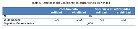 Para conocer el nivel de consenso entre los expertos, en relación al procedimiento y la secuencia de actividades propuestas en la concepción teórica modelada, se aplicó el Coeficiente de concordancia de Kendall que también conocido por W de Kendall es una medida no paramétrica que permite establecer el grado de similitud de dos variables ordinales.(19,22,23)