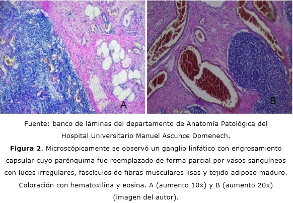 El diagnóstico anatomopatológico definitivo fue un hamartoma angiomatoso de ganglio linfático en región inguinal izquierda (Figura 2).